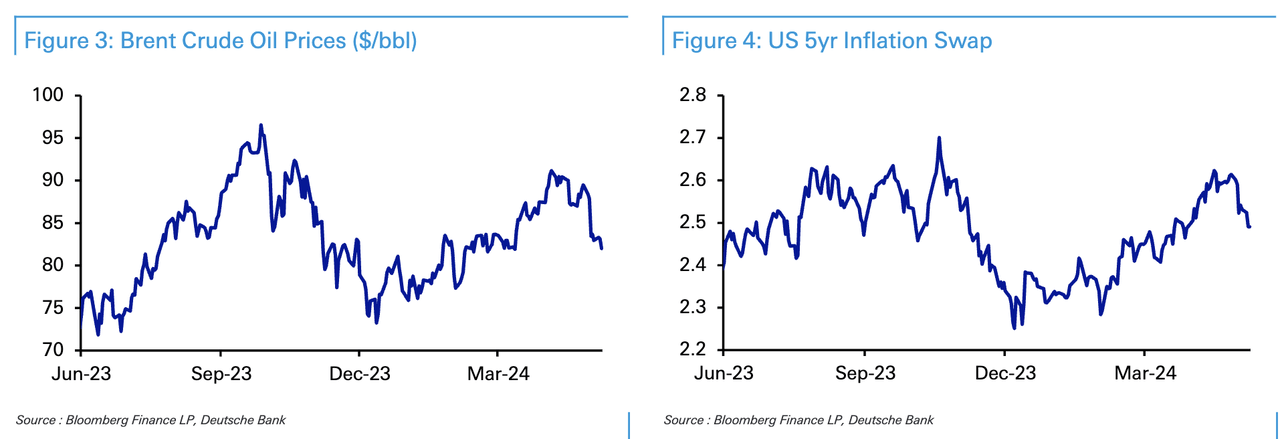 Brent crude (CO1:COM) at around $83/bbl was at its lowest price in almost two months, largely because fears of a wider geopolitical escalation haven’t materialized, in turn, lowering inflation expectations, Allen said. The U.S. 5-year inflation swap this week closed below 2.5% for the first time since late March.