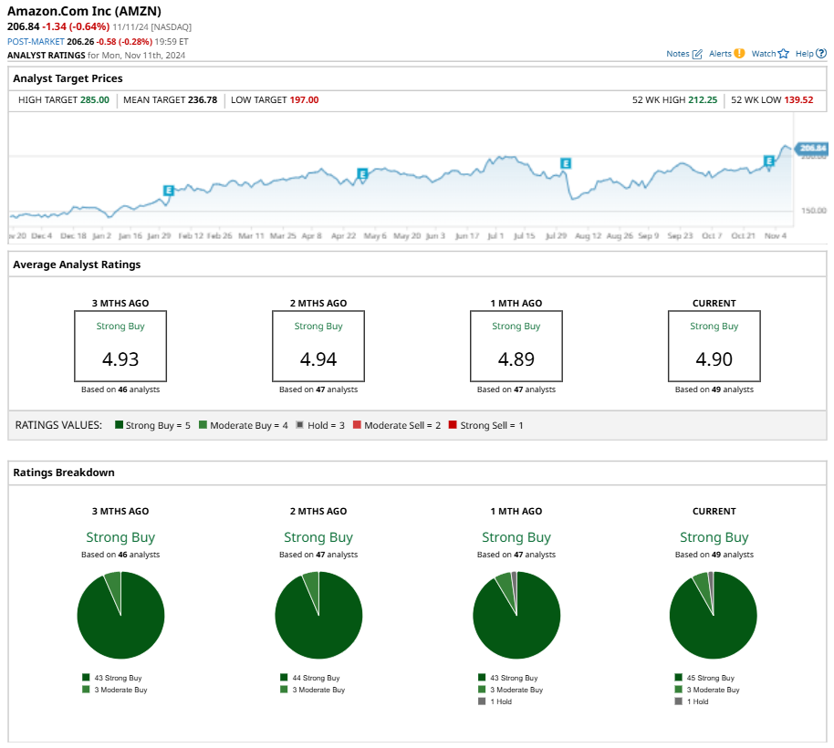 On Nov. 1, Citigroup Inc. (C) analyst Ronald Josey reaffirmed a “Buy” rating and increased the price target for AMZN to $252, implying a potential upside of 21.8% from current levels.