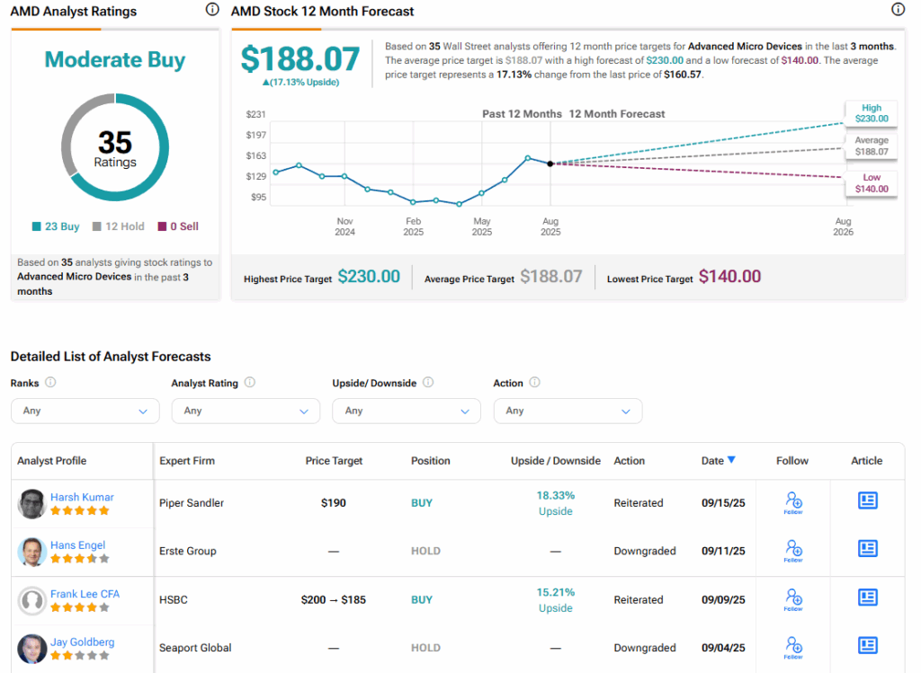 Turning to Wall Street, the analysts’ consensus rating for AMD is Moderate Buy, based on 23 Buy and 12 Hold ratings over the past three months. With that comes an average AMD stock price target of $188.07, representing a potential 17.13% upside for the shares.