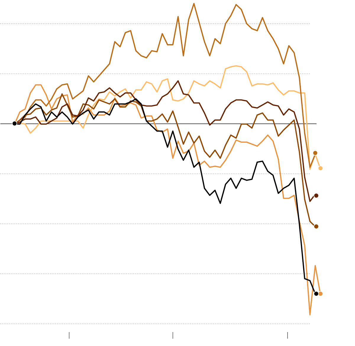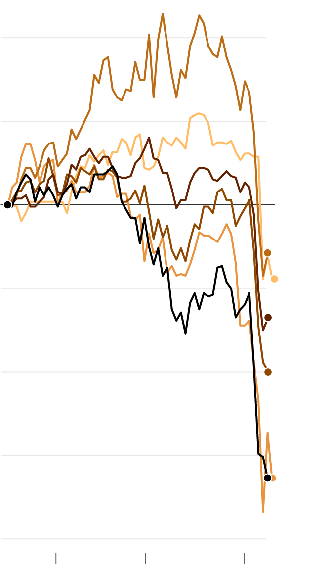 On Tuesday, the S&P 500 ended near a bear market, which is a 20 percent drop from a recent peak — a symbolic, and relatively rare and worrisome, threshold for investors. It closed 18.9 percent below its mid-February record, having plunged more than 12 percent just in the days since Mr. Trump announced his new tariffs.