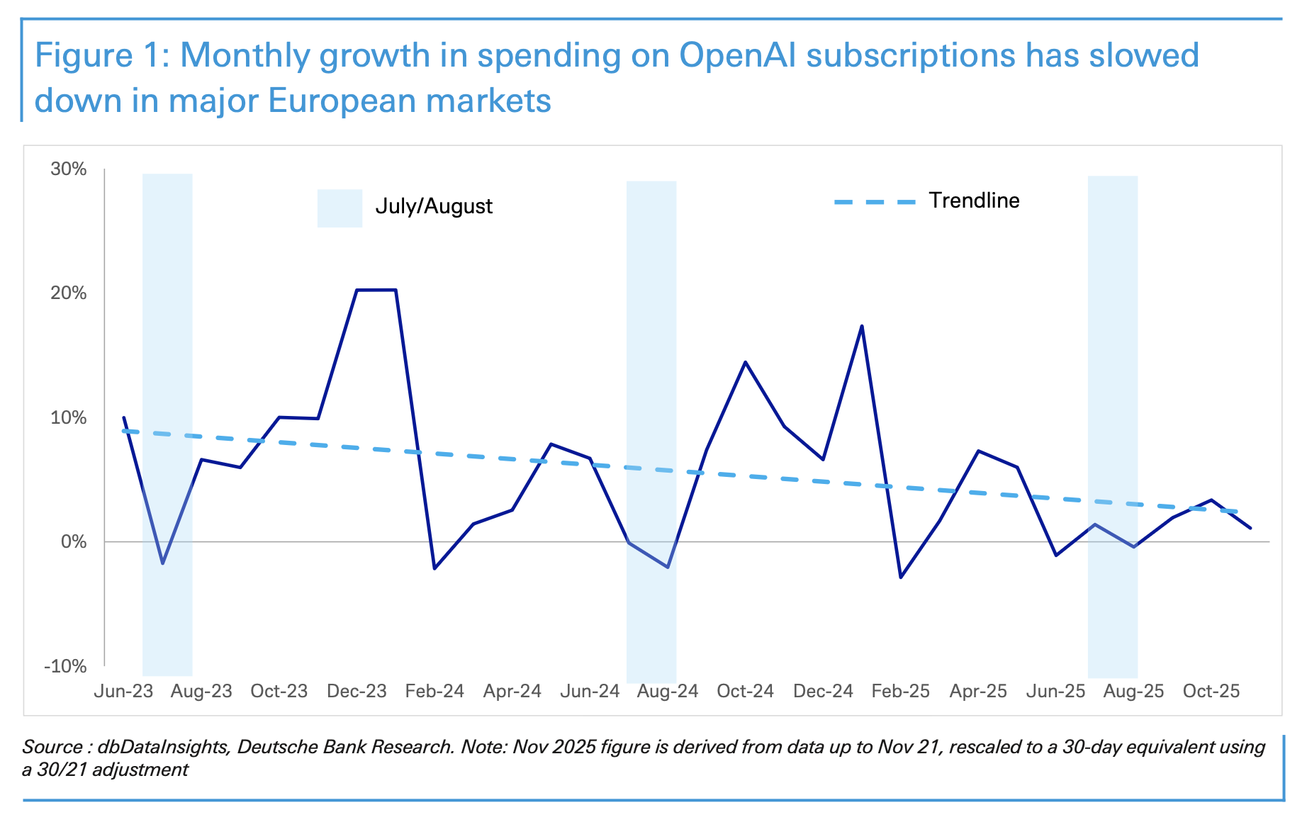 “The value of OpenAI subscriptions in the major European markets declined slightly in June and has been little changed since then … Unlike in the past two years, the pace of growth has not increased long after the annual summer slowdown, suggesting that the subscription model may be saturating,” they said.