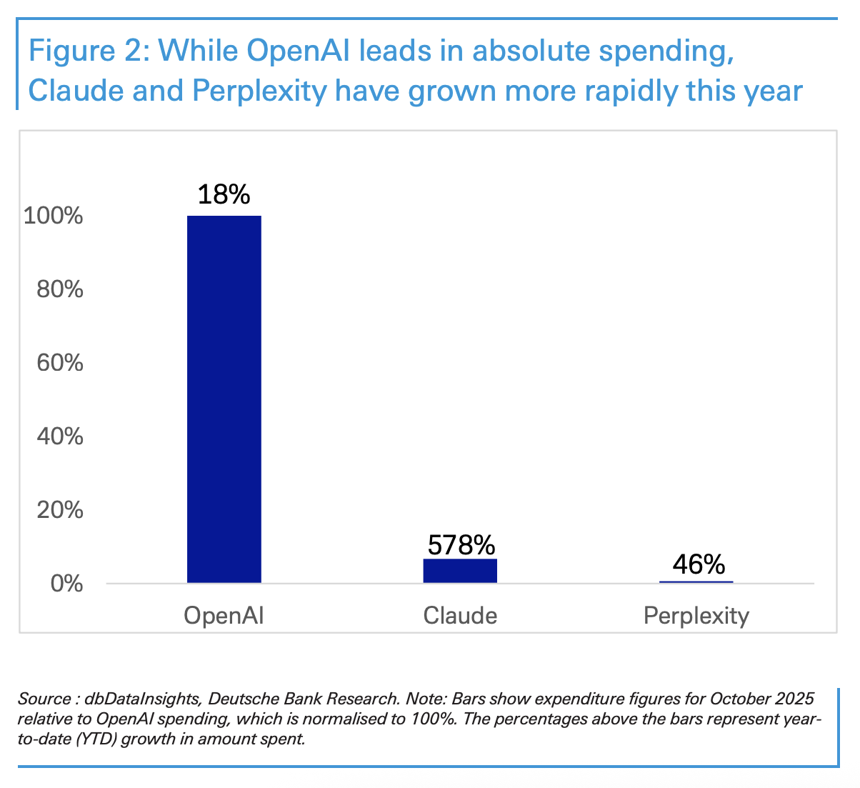 “The new data also show that the value of OpenAI subscriptions has increased 18% this year, compared with a near sevenfold increase in Anthropic’s Claude and 46% gain in Perplexity from much smaller bases,” the pair wrote.