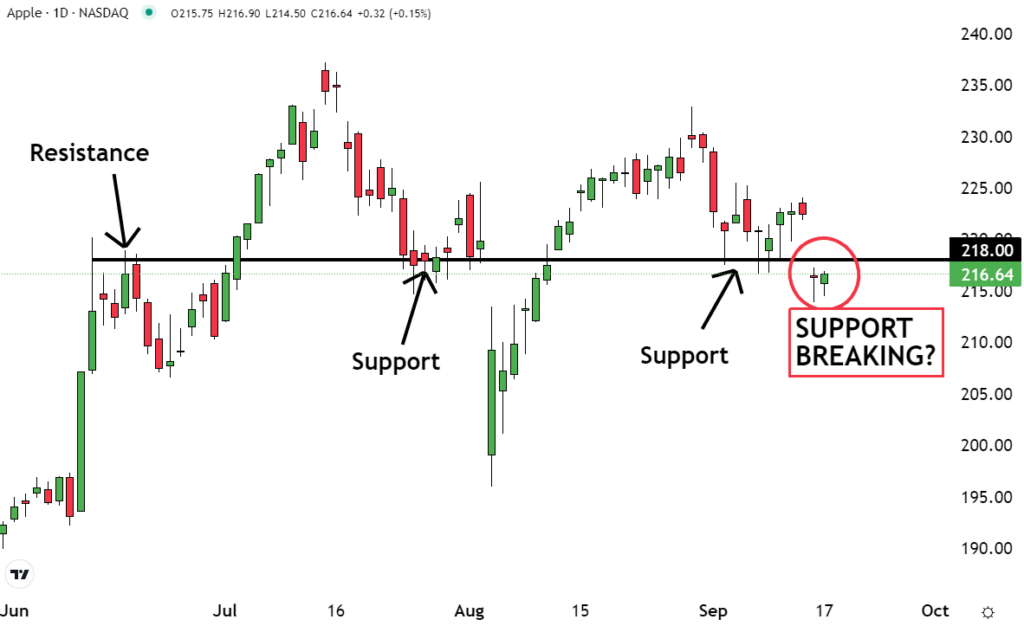 If the price eventually moves below the support, traders say the support was broken. As you can see on the chart, Apple Inc. AAPL may be breaking support around the $218 level. This is why it’s our Stock of the Day.