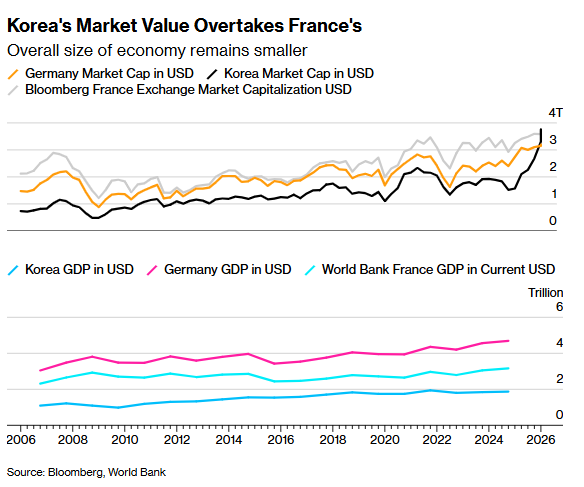 Note: In the above chart, black represents the market capitalization of South Korea’s stock market, orange represents the market capitalization of Germany’s stock market, and gray represents Bloomberg’s valuation of France’s stock exchange; in the chart below, from highest to lowest are the GDP scales of Germany, South Korea, and France respectively.