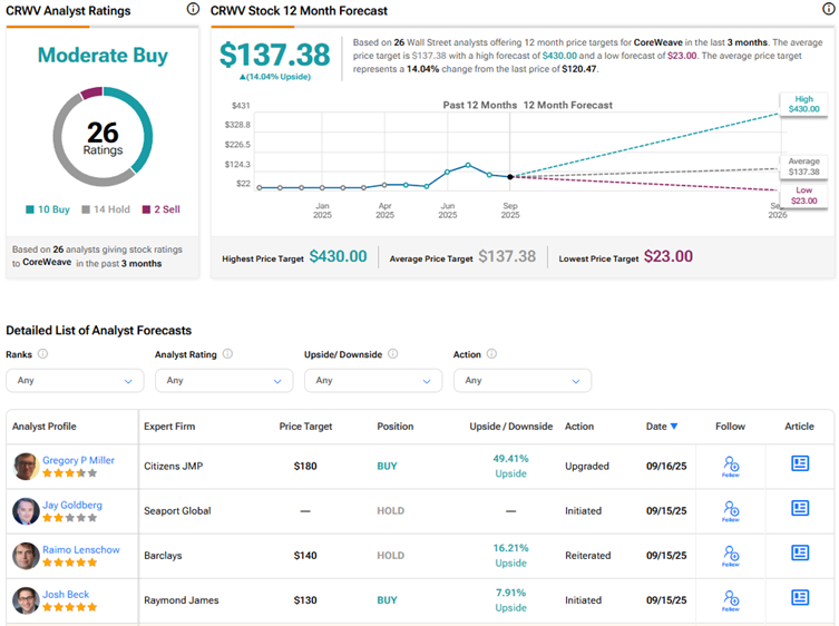 Overall, Wall Street has a Moderate Buy consensus rating on CoreWeave stock based on 10 Buys, 14 Holds, and two Sell recommendations. The average CRWV stock price target of $137.38 indicates 14% upside potential. CRWV stock is up 201% compared to its initial public offering (IPO) price of $40.