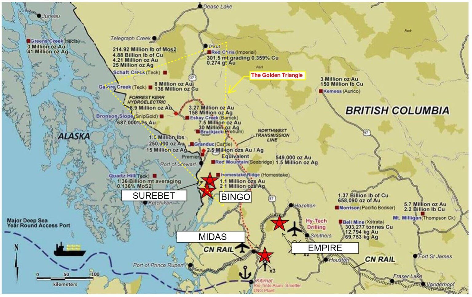 The Golden Triangle of Northwest British Columbia is one of the most active and mineralogically rich exploration camps in the world. The region currently hosts three operating mines: Brucejack, Red Chris, and the recently restarted Premier mine. A fourth mine, which is another restart at the Eskay Creek project, recently received project financing of US$ 750 million. The camp and its deposits are desirable for their quality, grade, size, and being in a safe jurisdiction. The market refers to the Golden Triangle as a Tier One jurisdiction. This discovery and development potential led to significant transactions over the past several years, as listed in Table 2, highlighting this market interest.”