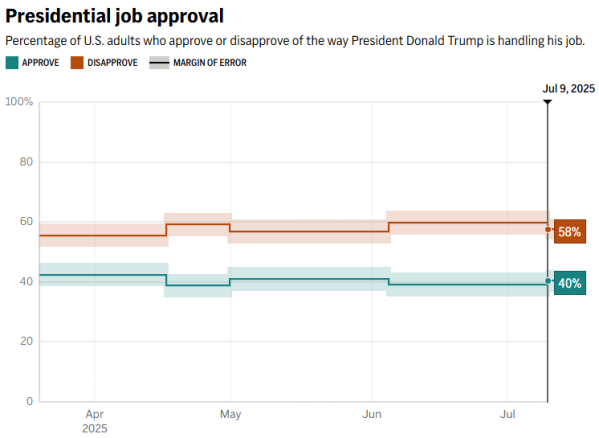 Ratings of Trump’s handling of the economy, which were more positive during his first term, have been persistently negative in his second term. The July poll found that few Americans think Trump’s policies have benefited them so far.