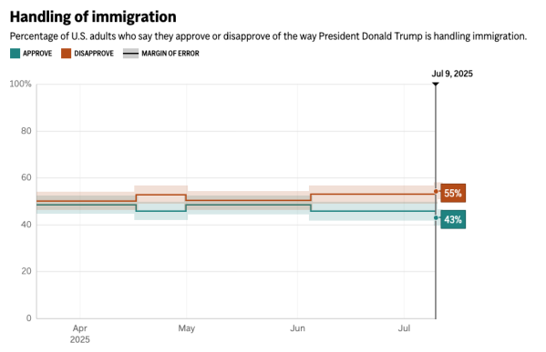 Other recent polls show growing discontent with Trump’s approach on immigration. A CNN/SSRS poll found that 55% of U.S. adults say the president has gone too far when it comes to deporting immigrants who are living in the United States illegally, an increase of 10 percentage points since February.