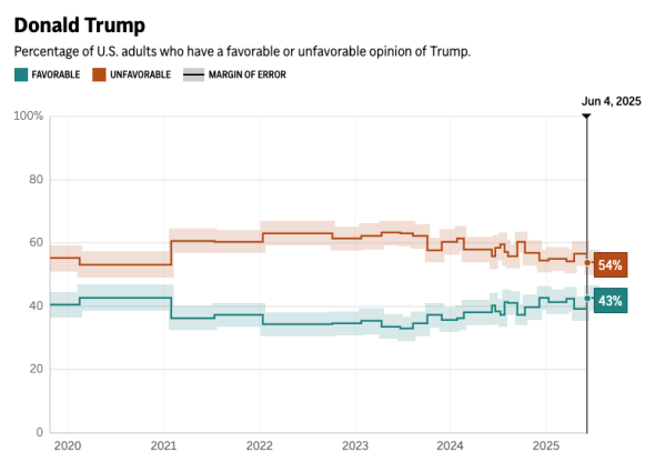 But even those shifts are within a relatively narrow range, which is typical for Trump. The new AP-NORC polling tracker shows that Trump’s favorability rating has remained largely steady since the end of his first term, with between 33% and 43% of U.S. adults saying they viewed him favorably across more than five years.