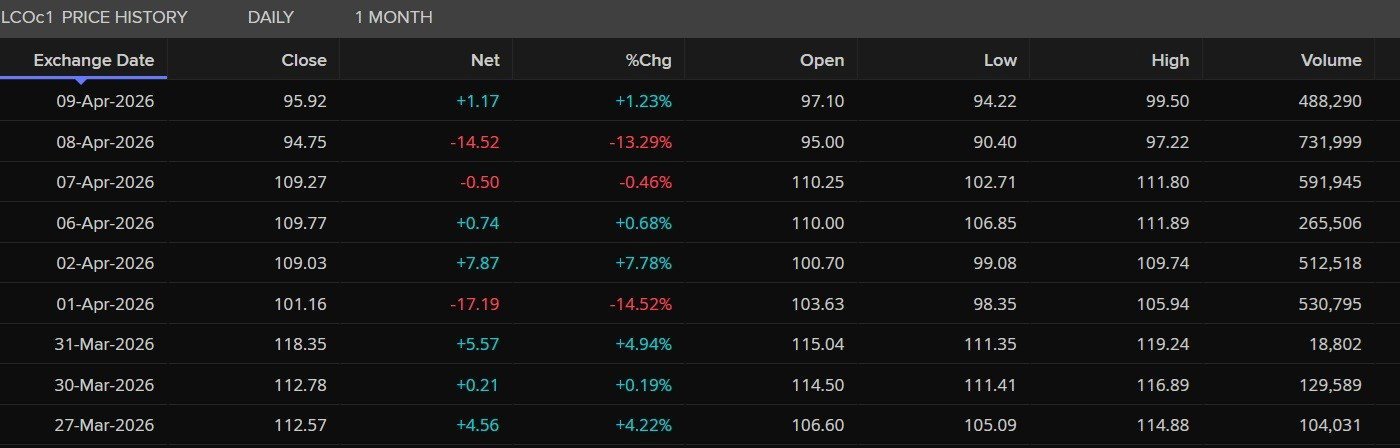 You can also see that as this deal was looking shaky yesterday, prices started rising again and almost hit $US100/barrel in the middle of April 9 trade.