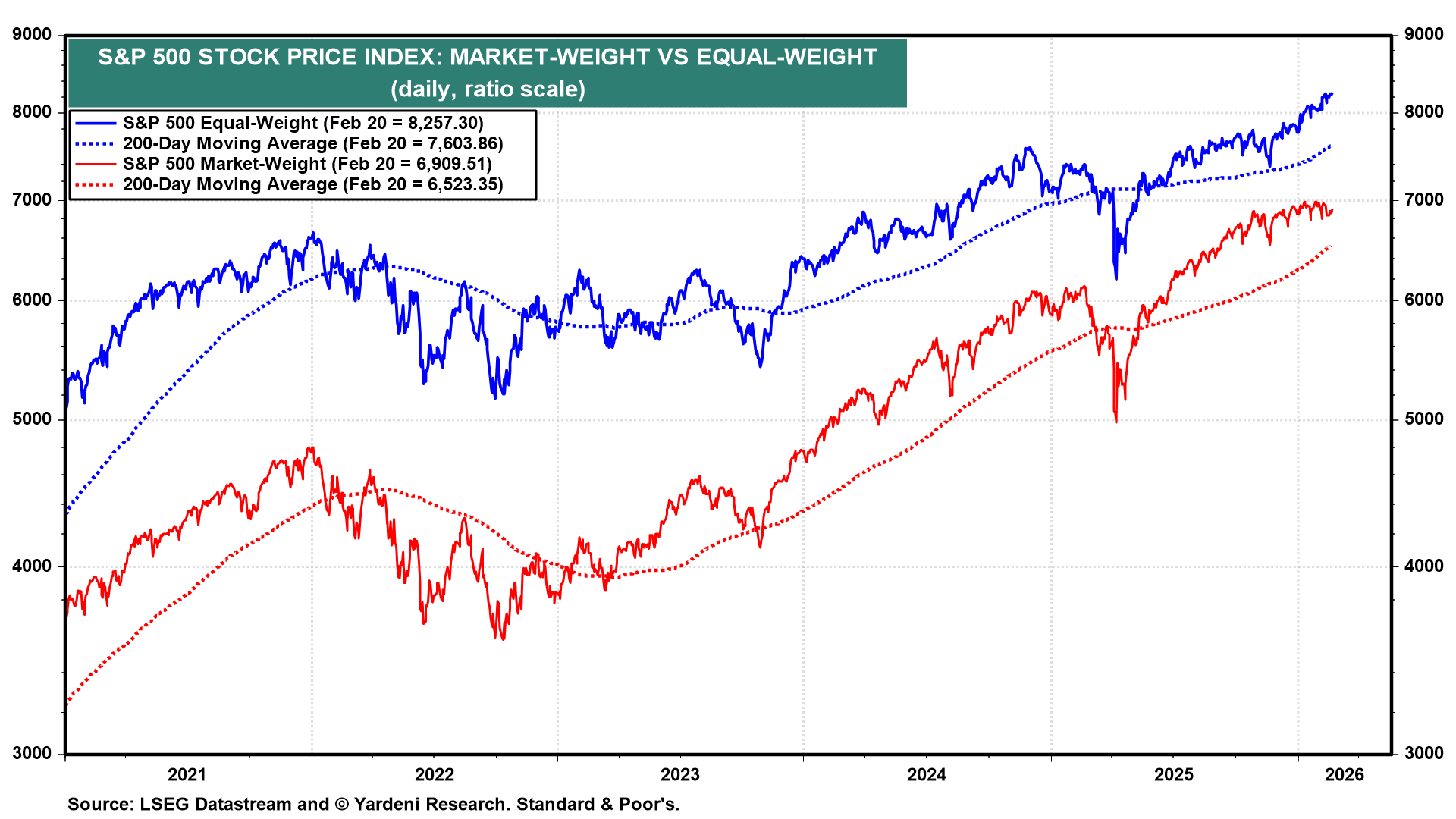 The equal-weight S&P 500 has been rising to record highs since the beginning of the year, while the market-weight S&P 500 has been literally loopy just below 7000 over the same period (chart). This has been mostly attributable to the stock market’s rotation in the type of outperforming stocks, from high-tech to low-tech industries. Previously, the former were supercharged by expectations that companies involved in AI were sure winners, while the latter lagged because investors figured it would take a while before AI benefited them. However, once the hyperscalers began massively increasing their spending on AI infrastructure, investors feared that the investments might not pay off. This mounting uncertainty triggered a rotation from high-tech industries that had gained much market-cap share in the S&P 500 to low-tech industries with much smaller market-cap share.