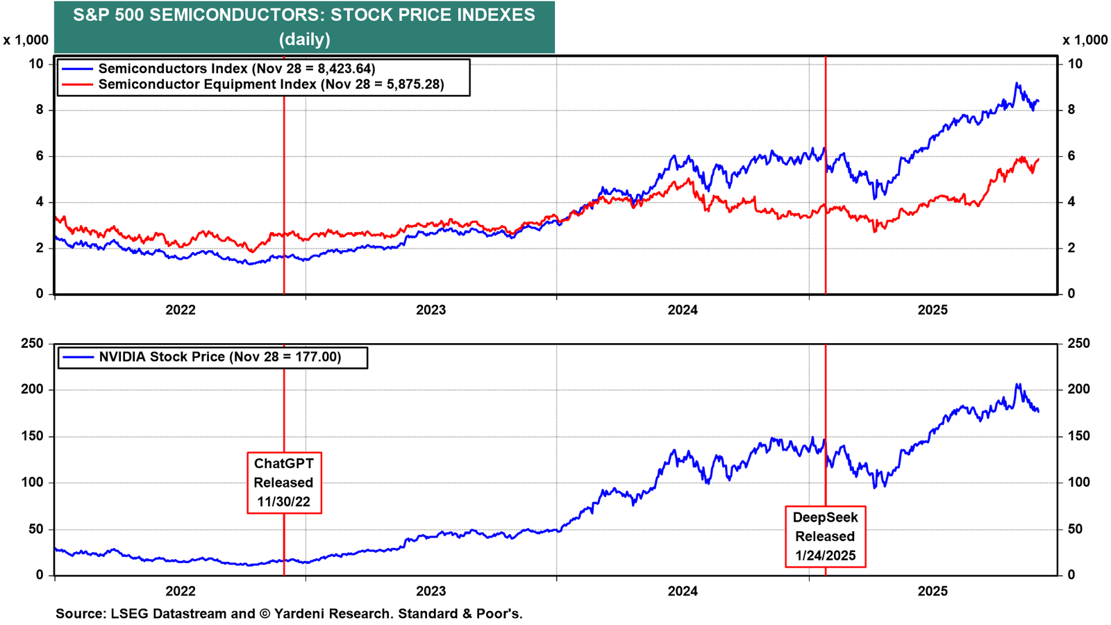 Then last week, Alphabet’s stock price jumped on news that Gemini-3, its latest LLM, is better than its competitors’ LLMs and was trained on a cheaper Google TPU chip. The broad stock market rebounded even though semiconductor stock price indexes, which had led the stock market rout a week ago, didn’t recover much this past week, as Nvidia remained down and out (chart).