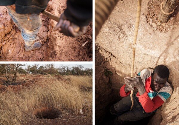 From top left: (1) A worker mines for gold. (2) A worker pulls himself from a gold mining pit. (3) A mining pit sits open and unmarked. (AP Photo/Annika Hammerschlag)