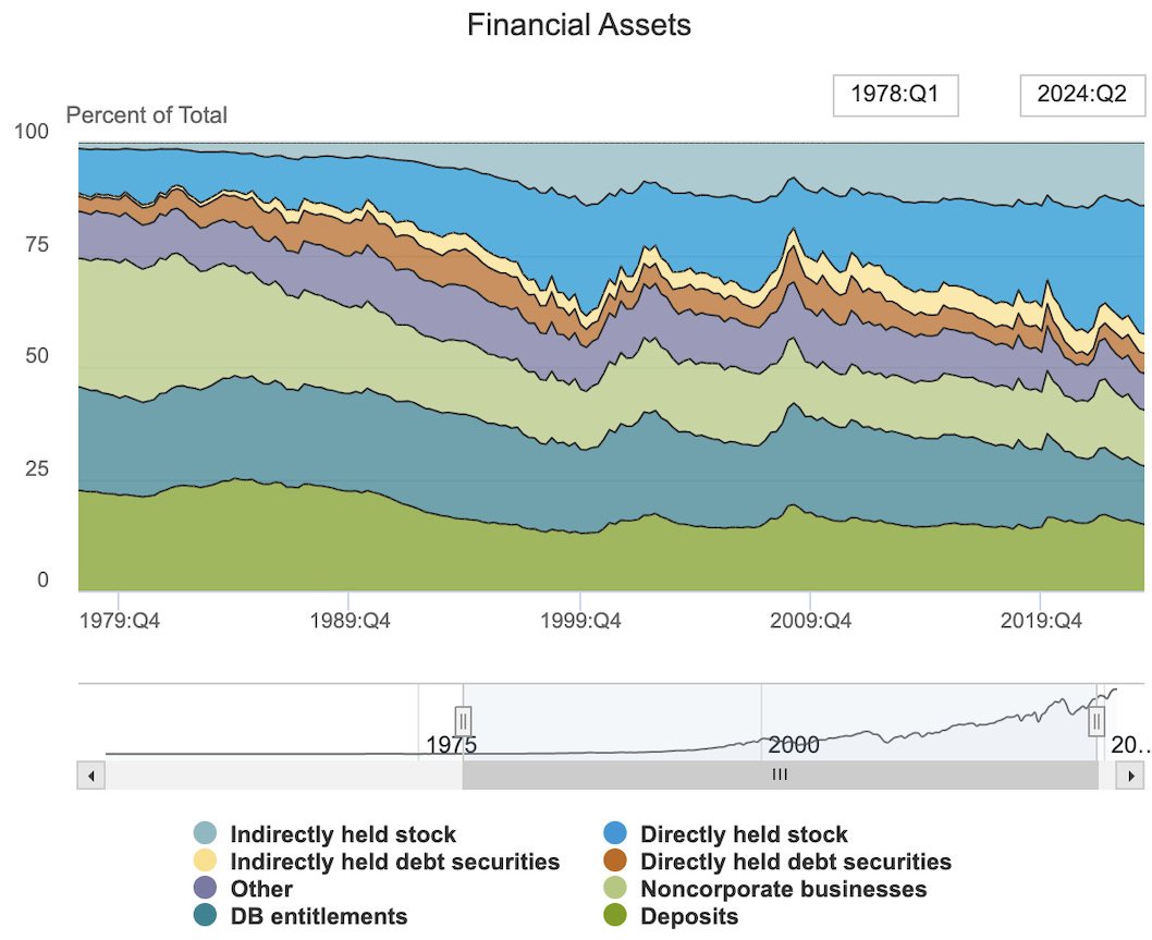 You can see the growing importance of equities from 1979 to 2024. This chart is broken out by percentage though if you’re curious, financial assets have increased from $5 trillion to $125 trillion.