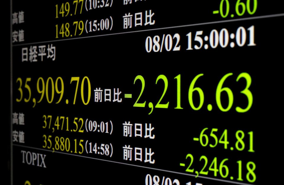 A financial data screen in Tokyo shows the Nikkei stock index tumbling by over 2,000 points on Aug. 2, 2024. (Kyodo)