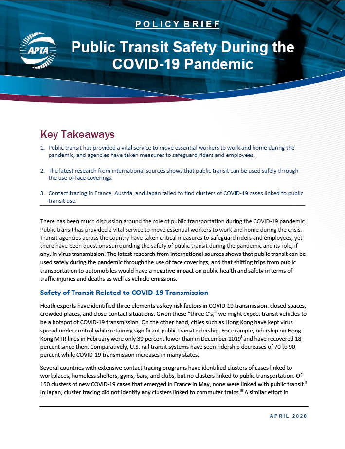 There has been much discussion around the role of public transportation during the COVID-19 pandemic. Public transit has provided a vital service to move essential workers to work and home during the crisis.Transit agencies across the country have taken critical measures to safeguard riders and employees, yet there have been questions surrounding the safety of public transit during the pandemic and its role, if any, in virus transmission. The latest research from international sources shows that public transit can be used safely during the pandemic through the use of face coverings, and contact tracing programs in several countries have failed to find clusters of cases linked to transit. In addition, shifting trips from public transportation to automobiles would have a negative impact on public health and safety in terms of traffic injuries and deaths as well as vehicle emissions.
