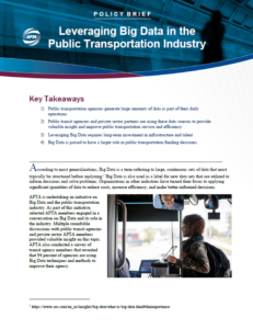 Public transportation agencies generate large amounts of data as part of their daily operations. These agencies are working with private sector partners to use these data sources to provide valuable insight and improve public transportation service and efficiency. Leveraging Big Data requires long-term investment in infrastructure and talent, and it is poised to have a larger role in public transportation funding decisions.