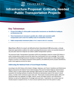 Bipartisan efforts to enact and infrastructure investment bill will provide a critically important opportunity to address the nation’s growing infrastructure needs. At least $232 billion in critical public transportation investments are identified for funding by an infrastructure bill.