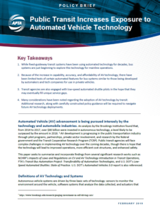 Automated Vehicle (AV) advancement is being pursued intensely by the technology and automobile industries. AV development is progressing in the public transportation industry through pilot programs, partnerships, private sector involvement, and research by the federal government and the Transit Cooperative Research Program (TCRP). Public transit agencies will face complex challenges in implementing AV technology over the coming decades, though there is hope that it will lead to improved operations, more efficient cost structures, and enhanced safety.