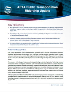 September 2022Ridership rebounded to more than 70 percent of pre-pandemic levels in September 2022, according to the latest data from APTA’s Ridership Trends Dashboard. After declining to 20 percent of pre-pandemic levels in April 2020, ridership recovered to nearly 40 percent of pre-pandemic ridership in summer 2020. By summer 2021, after the introduction of COVID-19 vaccines, ridership had recovered to just over 50 percent of pre-pandemic levels. After dipping due to the omicron wave, ridership recovered in spring and summer 2022 to stand at just over 70 percent of pre-pandemic levels in September 2022.