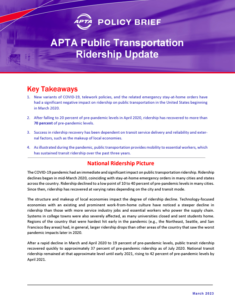 Ridership rebounded to more than 70 percent of pre-pandemic levels in March 2023, according to the latest data from APTA’s Ridership Trends Dashboard. After declining to 20 percent of pre-pandemic levels in April 2020, ridership recovered to nearly 40 percent of pre-pandemic ridership in summer 2020. By summer 2021, after the introduction of COVID-19 vaccines, ridership had recovered to just over 50 percent of pre-pandemic levels. After dipping due to the omicron wave, ridership recovered throughout 2022 to stand at over 70 percent of pre-pandemic levels in March 2023.