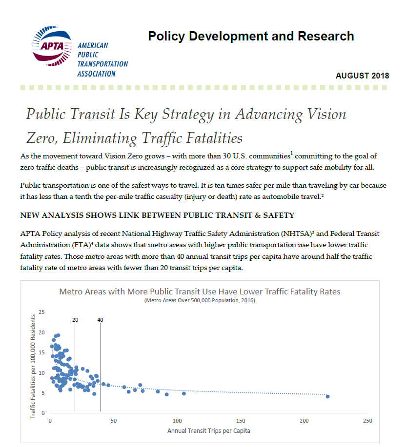 As the movement toward Vision Zero grows, public transit is increasingly recognized as a core strategy to support safe mobility for all. Public transportation is one of the safest ways to travel. It is ten times safer per mile than traveling by car because it has less than a tenth the per-mile traffic casualty (injury or death) rate as automobile travel.