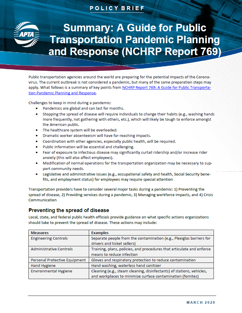 This summary of NCHRP Report 769 gives transit agencies and other organizations information on how to prepare for the potential impacts of the coronavirus.