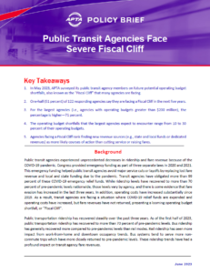 Public transit agencies experienced unprecedented decreases in ridership and fare revenue because of the COVID-19 pandemic. Transit agencies have obligated more than 99 percent of emergency funding provided by Congress. While ridership levels have recovered to more than 70 percent of pre-pandemic levels nationwide, agencies are facing looming operating budget shortfalls, or “Fiscal Cliffs.” APTA’s survey of public transportation agencies has found that one-half of all agencies, and 71 percent of the largest agencies (those with annual operating budgets over $200 million) expect to face a fiscal cliff in the next five fiscal years.