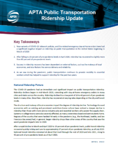 Public transportation has been and will continue to be an essential frontline service, particularly during the COVID-19 pandemic. Public transit continues to provide a vital lifeline to communities nationwide. This survey of APTA transit agency members was conducted in late April 2020. The survey found: