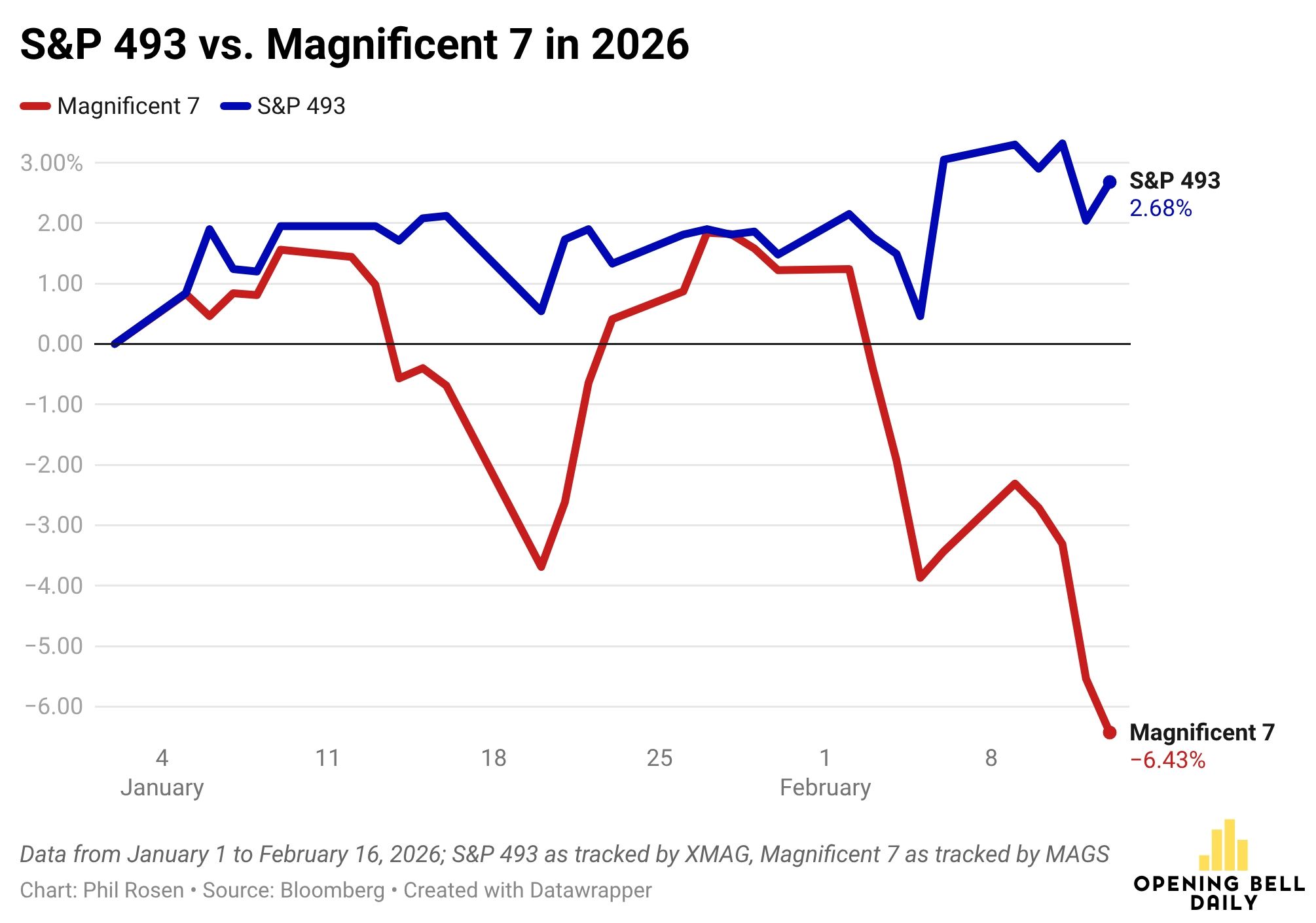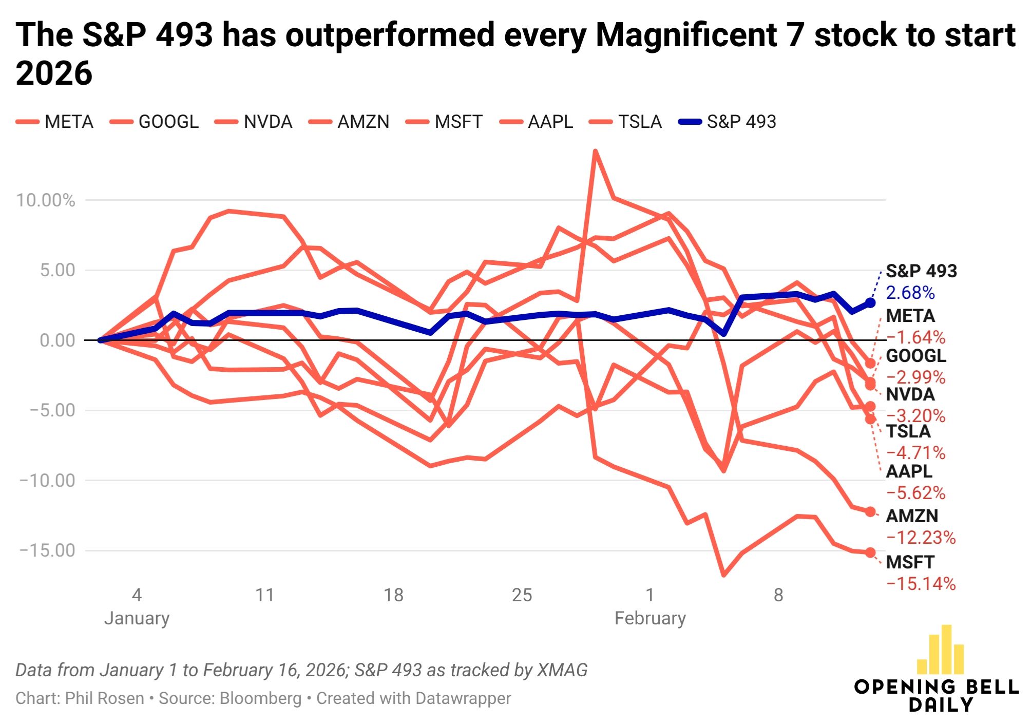 The “rest of market” trade has outperformed to start the year, with investors increasingly looking for AI’s near-term monetization rather than long-term potential.