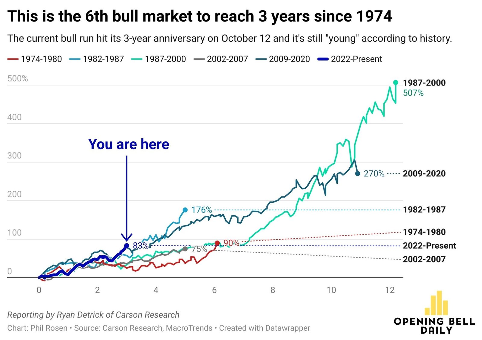 There have been 11 other bull markets since World War II, and only once did a bull make it this far without reaching its fourth anniversary.