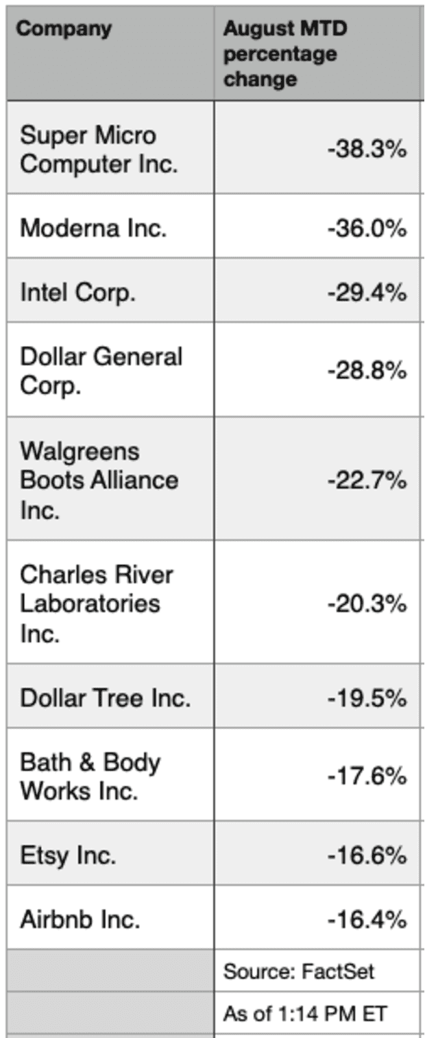Next up among the August losers are shares of Moderna Inc. and Intel Corp. Moderna is dealing with waning vaccine demand, while Intel faces financial predicaments as it builds out its manufacturing business at a time of struggles in the core business.