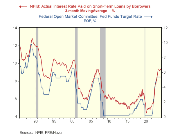 Of course, not all loans are linked to market-based rates. Small business loans, as well as auto loans and other forms of consumer lending, are linked to the prime rate, which is tied to the Fed funds rate. As the chart below shows, actual interest rates paid by small businesses are higher than they have been in decades.