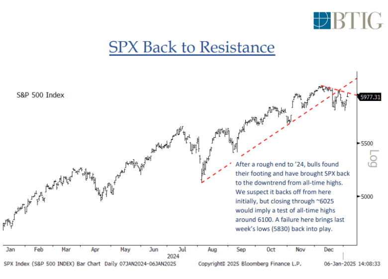 “We suspect it backs off from here initially, but closing through ~6025 would imply a test of all-time highs around 6100. A failure here brings last week’s lows (5830) back into play,” he says.