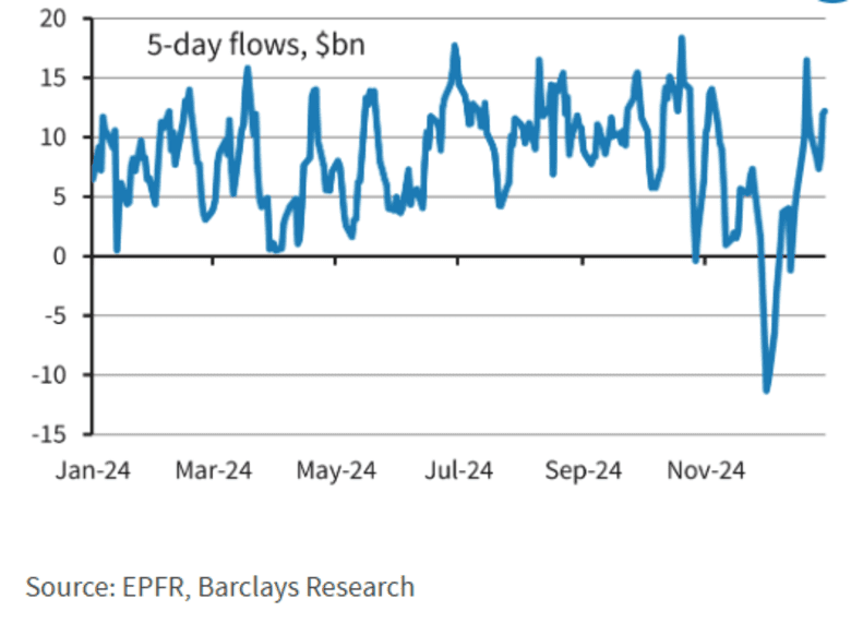 Over the five-day period that ended on Friday, U.S. bond funds posted $12.2 billion of inflows, compared with the prior four-week average of $2.4 billion in inflows, according to Barclays.