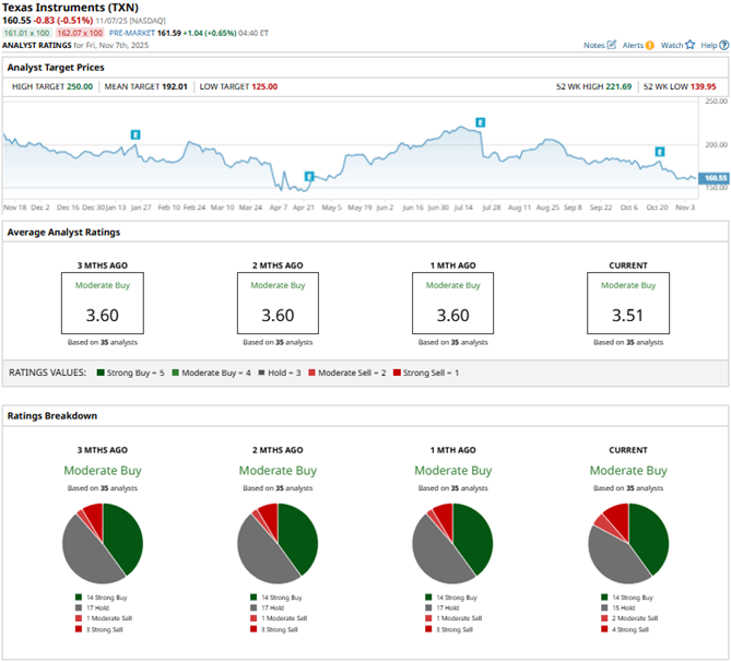 Among the 35 Wall Street analysts covering Texas Instruments’ stock, the consensus is a “Moderate Buy.” That’s based on 14 “Strong Buy” ratings, 15 “Holds,” two “Moderate Sells,” and four “Strong Sells.” The ratings configuration has become more bearish over the past month, with four “Strong Sell” ratings now, up from three previously.