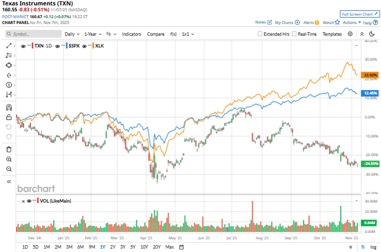 Factors such as supply chain constraints, global economic uncertainty, and a slowdown in demand for consumer electronics have impacted Texas Instruments’ stock trajectory. Over the past 52 weeks, the stock has declined 26.2%, while it has decreased by 2.6% over the past six months. It had reached a 52-week high of $221.69 in July, but is down 27.6% from that level.