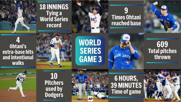 LOS ANGELES (AP) — The Los Angeles Dodgers outlasted the Toronto Blue Jays with a 6-5, 18-inning win in Game 3 of the World Series on Monday night, producing a lengthy list of records topped by Shohei Ohtani as they took a 2-1 lead in the best-of-seven matchup.