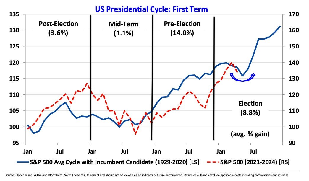 From Oppenheimer’s Ari Wald: “The S&P 500 has closely followed its typical seasonal trajectory in recent years. Looking ahead, we believe seasonals indicate the potential for market consolidation should be used opportunistically to buy stocks ahead of seasonal tailwinds between June and August.“