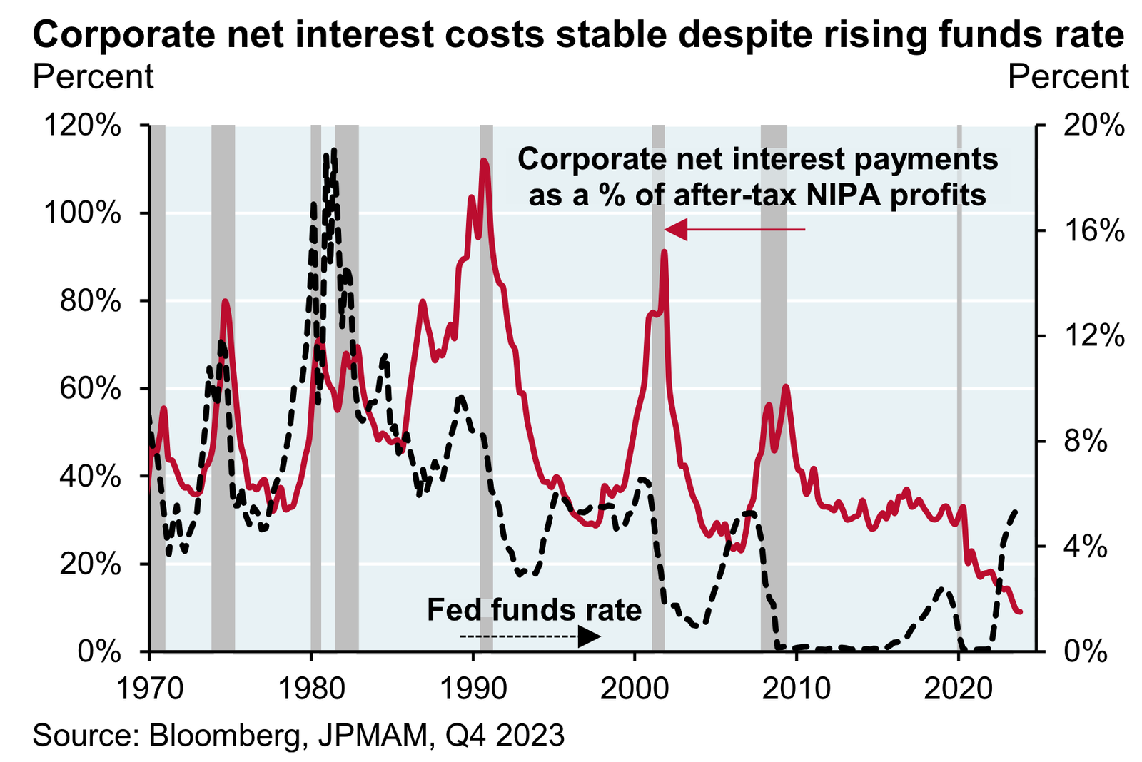 Despite tight monetary policy and elevated interest rates, corporate net interest costs remain low. This is thanks to a combination of debt that’s largely locked in low rates and elevated cash balances earning more interest.