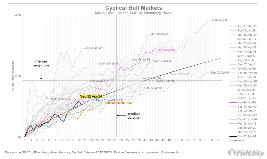 From Fidelity’s Jurrien Timmer: “The cyclical bull market is 19 months old, with a gain of 46% (down from high of 50% in March). It’s modest, but in line with previous soft landings.“