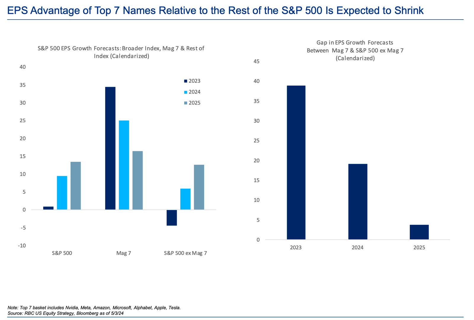 The “Magnificent 7” stocks — Microsoft MSFT, Apple MSFT, Alphabet GOOGL, NVIDIA NVDA, Amazon AMZN, Meta Platforms META, and Tesla TSLA — have led the market higher thanks to outsized earnings growth. However, earnings growth is expected to cool for those names as they heat up for the other 493 stocks of the S&P 500.
