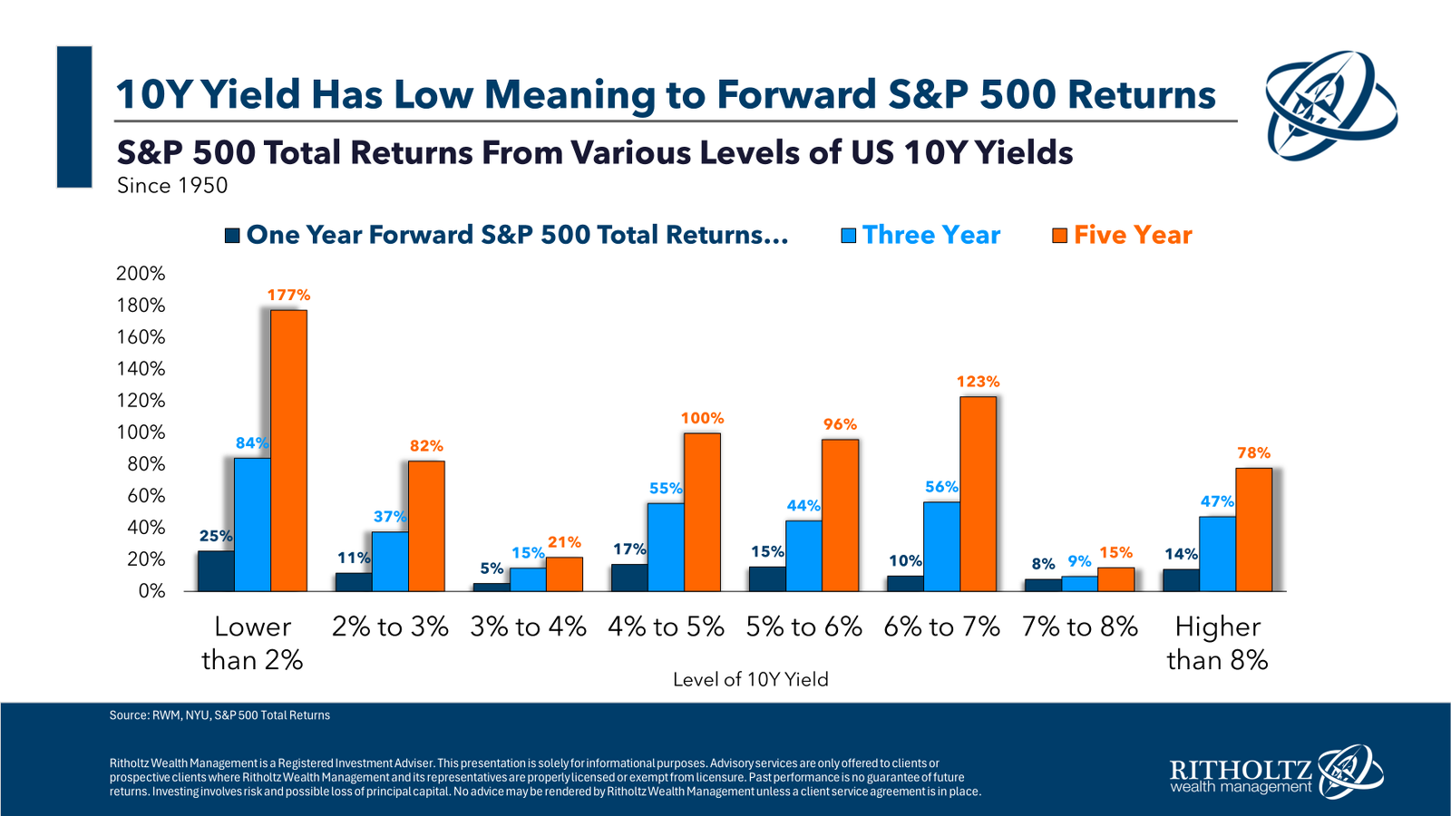 From Ritholtz Wealth Management’s Ben Carlson: “The relationship between interest rates and stock market performance is murky at best… It’s certainly not a one-to-one correlation where higher rates lead to lower returns. The lowest returns have come in the 3-4% and 7-8% ranges. The best returns have come when rates are 2% or less, which makes sense when you consider rates were only that low during two of the biggest crises this century (the GFC and Covid). Look at the 4% to 6% range, which is where we are now. The returns have been pretty good. Maybe one of the reasons for this is because the average 10 year yield since 1950 is 5.4% (the median is 4.7%). Rates like this occur during normal times (if such a thing exists).“