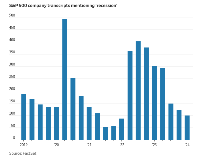 According to The Wall Street Journal’s Justin Lahart: “Among companies in the S&P 500, the term ‘recession’ showed up in just 100 transcripts of earnings calls, investor events and conferences recorded in the first quarter, according to FactSet. That was down from 302 in the first quarter of 2023, and the fewest in two years.“
