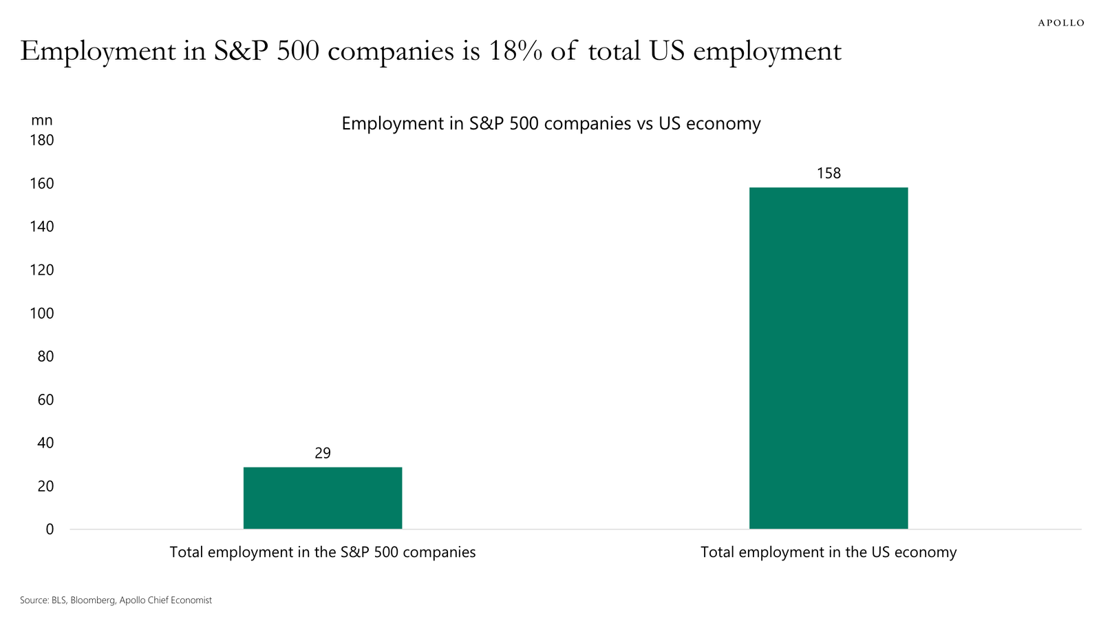 From Apollo Global’s Torsten Slok: “Total global employment in the S&P 500 companies is 29 million, and total employment in the US economy is 158 million, see chart below. Put differently, more than 80% of total employment in the US economy is outside the S&P 500 companies.“
