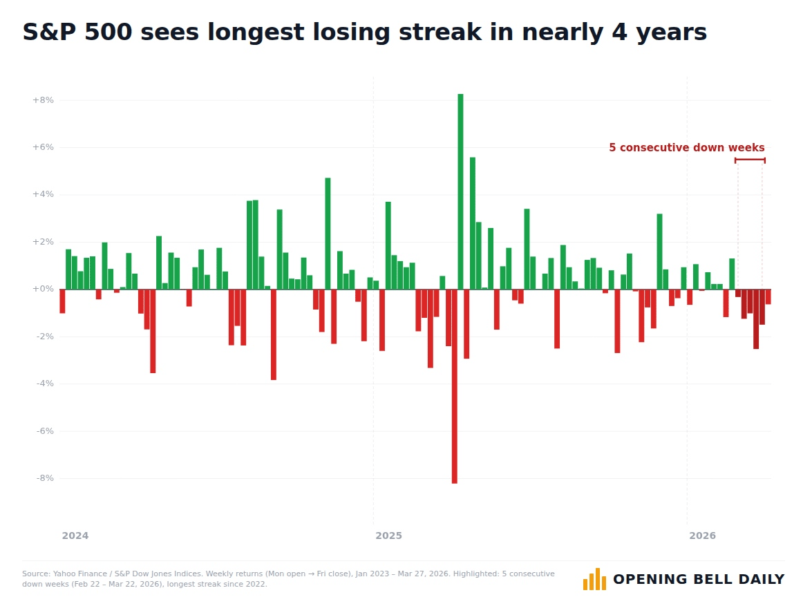 The S&P 500 has dropped five weeks in a row for the first time in nearly four years.