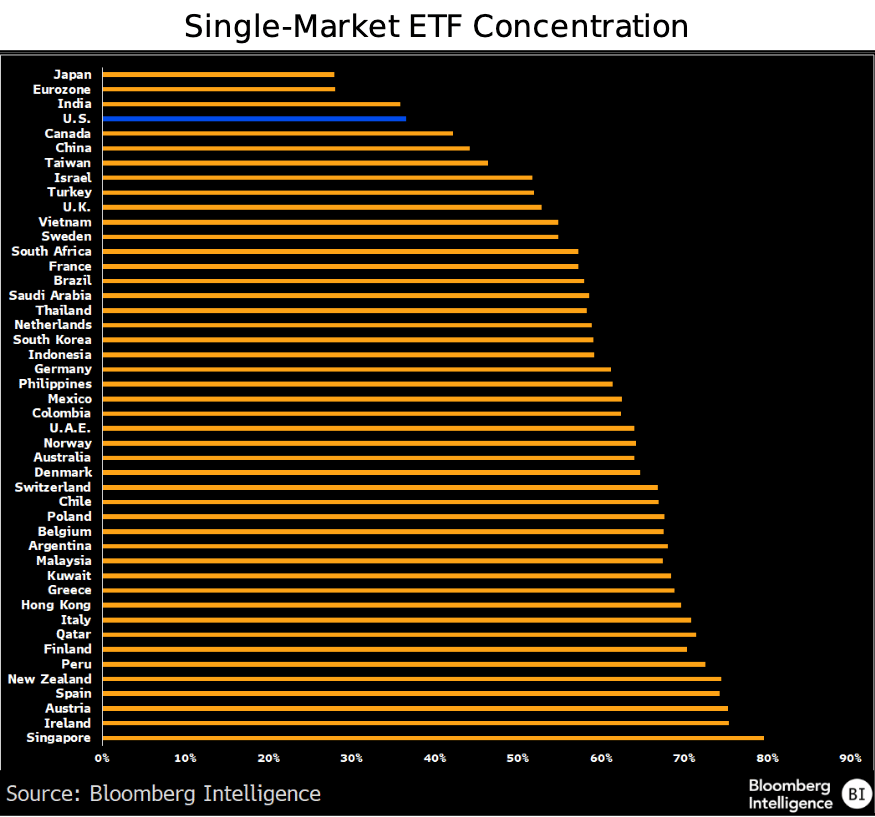 Bloomberg strategists surveyed dozens of single-market ETFs globally and found that the US ranks among the least concentrated equity markets in the world.