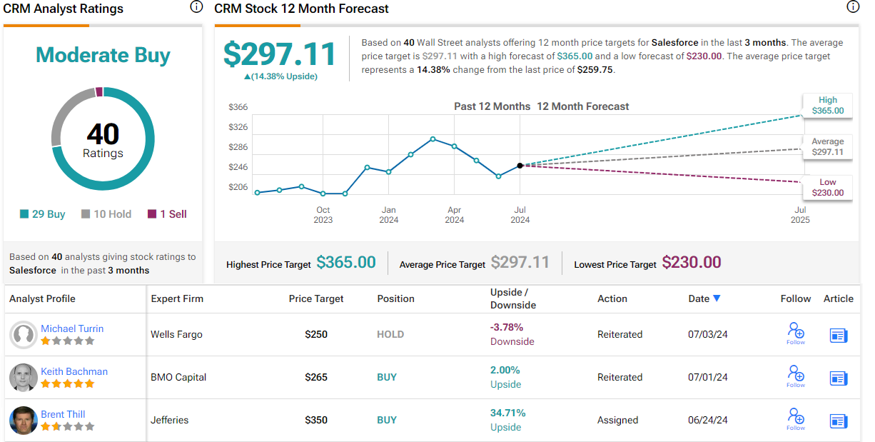 There are 40 recent analyst reviews on record for Salesforce shares and they break down to 29 Buys, 10 Holds, and 1 Sell, giving the stock its Moderate Buy consensus rating. The shares are priced at $259.81, with a $297.11 average target price that indicates potential for a 14% upside on the one-year horizon. (See CRM stock forecast)