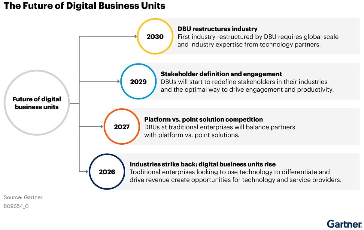 Secondo Gartner, le Unità Aziendali Digitali sono definite come segmenti aziendali che creano nuove attività basate su digitalizzazione servendo settori verticali tradizionali o arene di dominio. Queste unità spesso collaborano e competono anche con fornitori di tecnologia e servizi tradizionali. Il rapporto evidenzia che le aziende tradizionali nei settori manifatturiero, finanziario e oil & gas stanno investendo in DBU separate per sfruttare la loro expertise nel dominio verticale e la tecnologia digitale per migliorare il servizio clienti e la crescita dei ricavi.