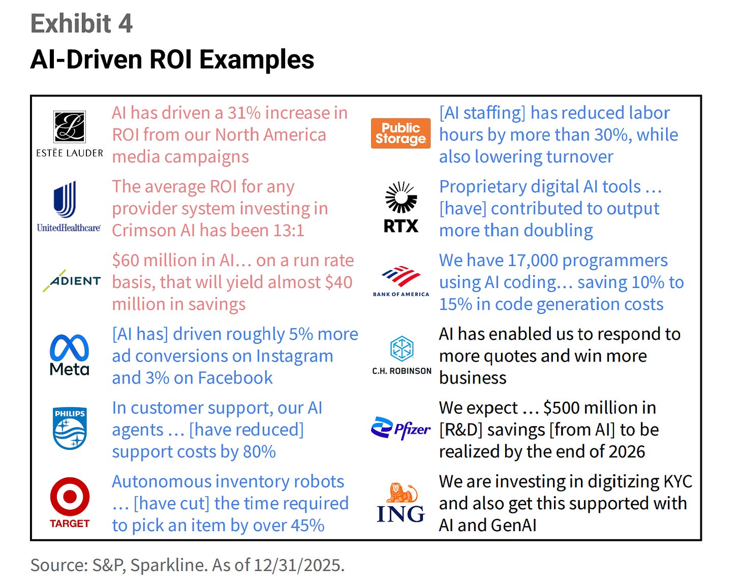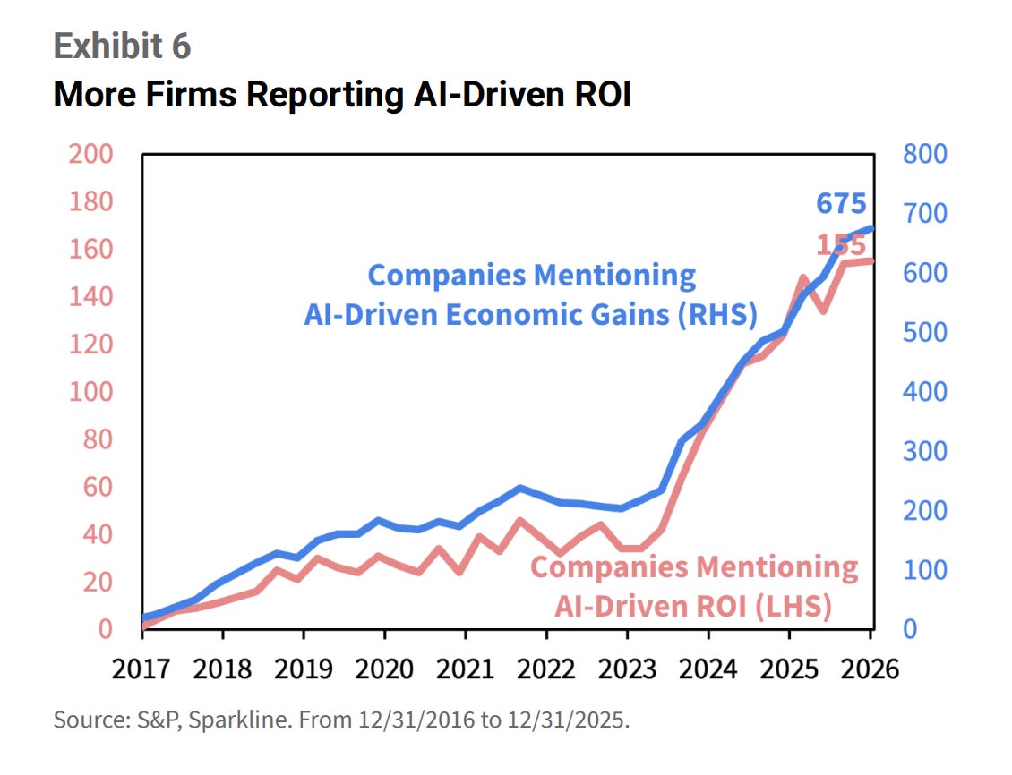 Sparkline Capital’s Kai Wu recently stepped up and tackled this problem. He dug into earnings calls and analyzed mentions of AI adoption. Specifically, he screened these mentions for references to AI-driven economic gains and returns on investment.